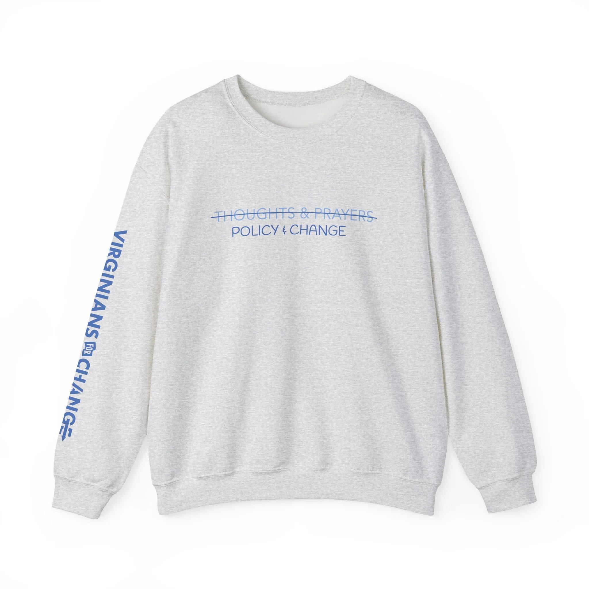 This sweatshirt speaks like a neighbor who refuses to look away. Soft, substantial, and quietly bold — it carries the message of the words "Thoughts & Prayers" crossed our with “Policy & Change” written below with a stitched Virginians For Change logo running down the sleeve, the kind of honest detail that starts conversations without shouting. The medium-heavy 50/50 cotton-poly blend feels familiar and warm on a blustery morning or at an organizing meeting. Tubular knit and ribbed collar hold shape through repeated wear. Thoughtful construction — double-needle seams, tear-away label, and sustainably grown U.S. cotton — means it stands up to rallies, school-grounds vigils, and everyday errands alike. Wear it layered under a coat or on its own; let the sleeve logo catch a neighbor’s eye and open the kind of dialogue that stays focused on safety and community.