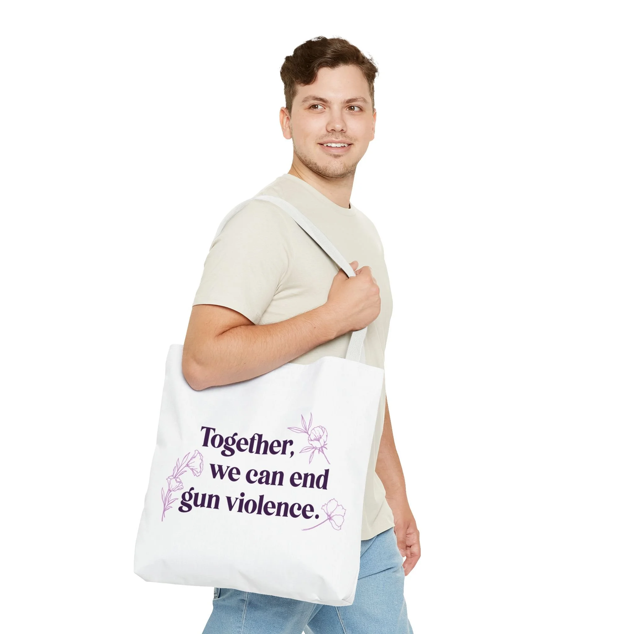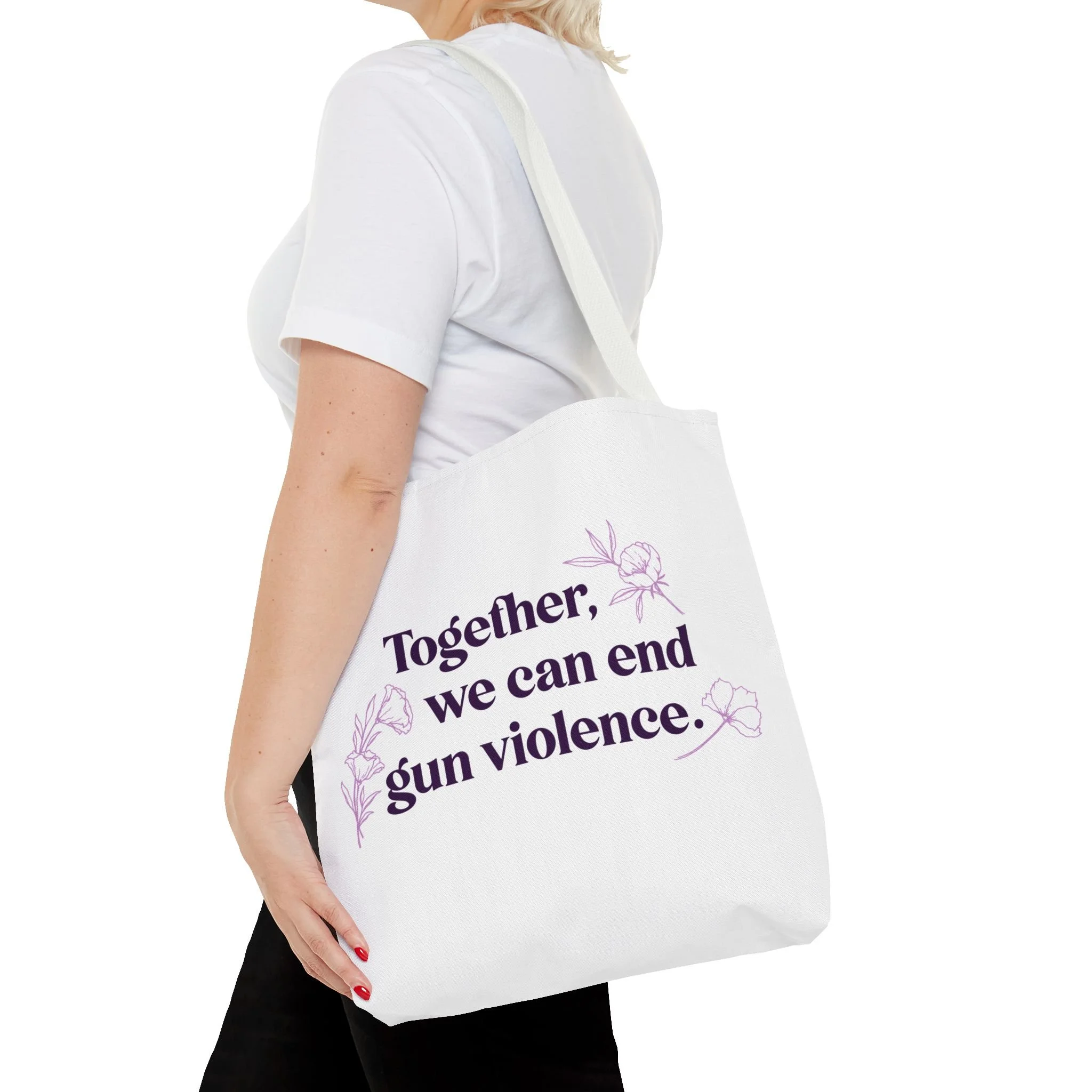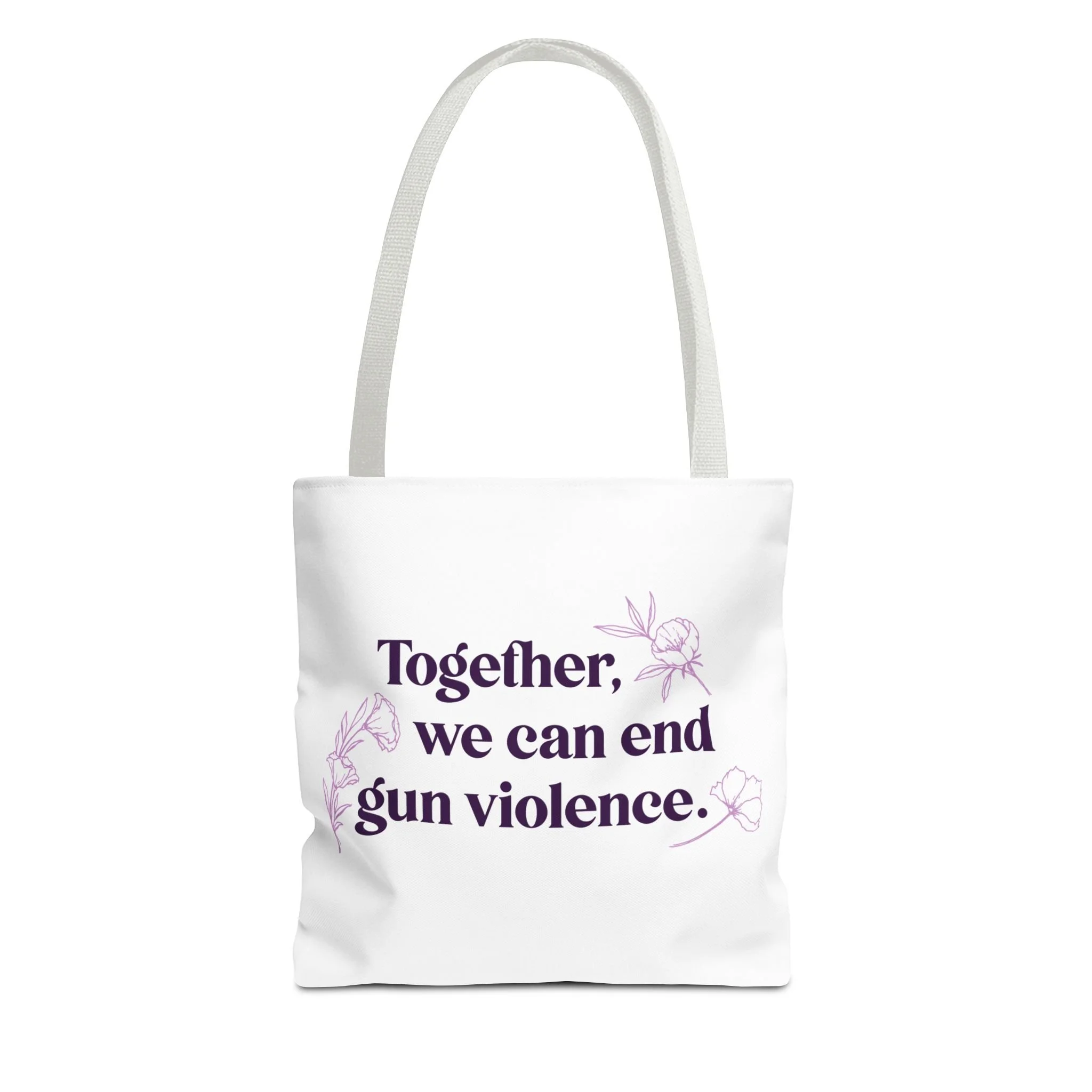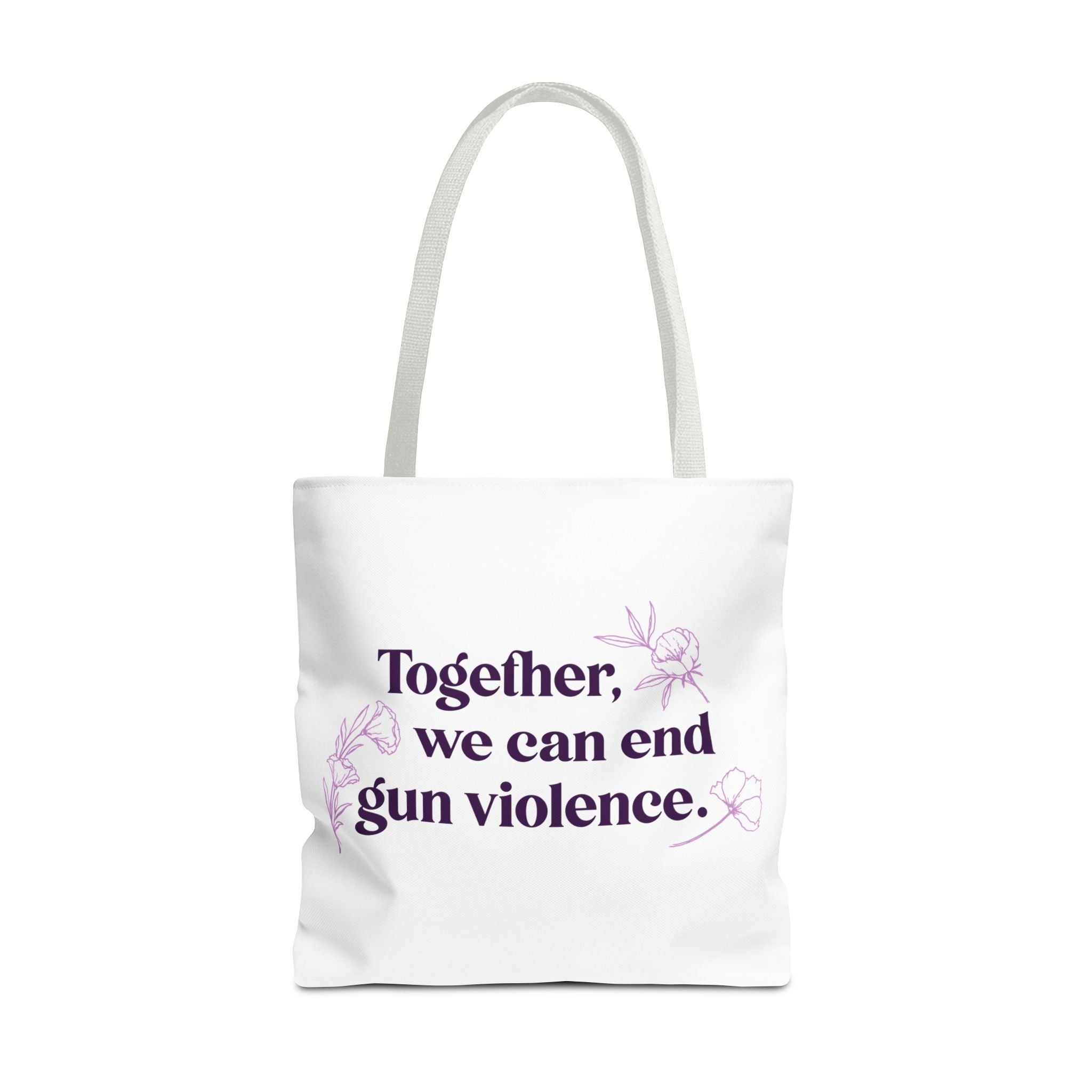 This sturdy tote carries more than belongings — it carries a message. The canvas-like polyester holds a framed “Together we can end gun violence” design surrounded by poppy blooms, lending a gentle, hopeful touch to a bold statement. Spacious boxed corners and a reinforced handle mean it moves with you: to marches, community meetings, campus days, or quiet errands. The floral frame softens the message, inviting conversation without shouting. Lightweight yet durable, it lays flat when not in use and stands ready when you need to pack flyers, a water bottle, and extra layers. It’s for people who want their daily carry to reflect their values and spark connection.